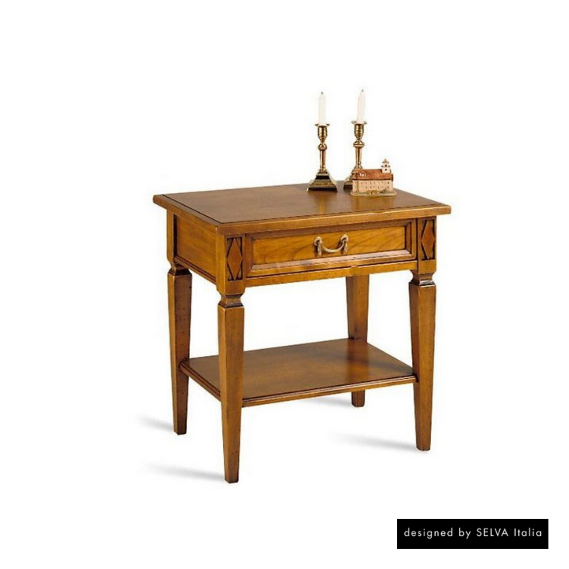 Kommödchen, Stil Directoire. 1 Lade, 1 fester Ablageboden aus Holz. Füße in Buche massiv. Massivteile in Linde, Kirschbaum furniert. Rückwand furniert. Es stehen zwei verschiedene Griffe zur Auswahl: Griff Louis XVI (M01), Griff Directoire (M02).