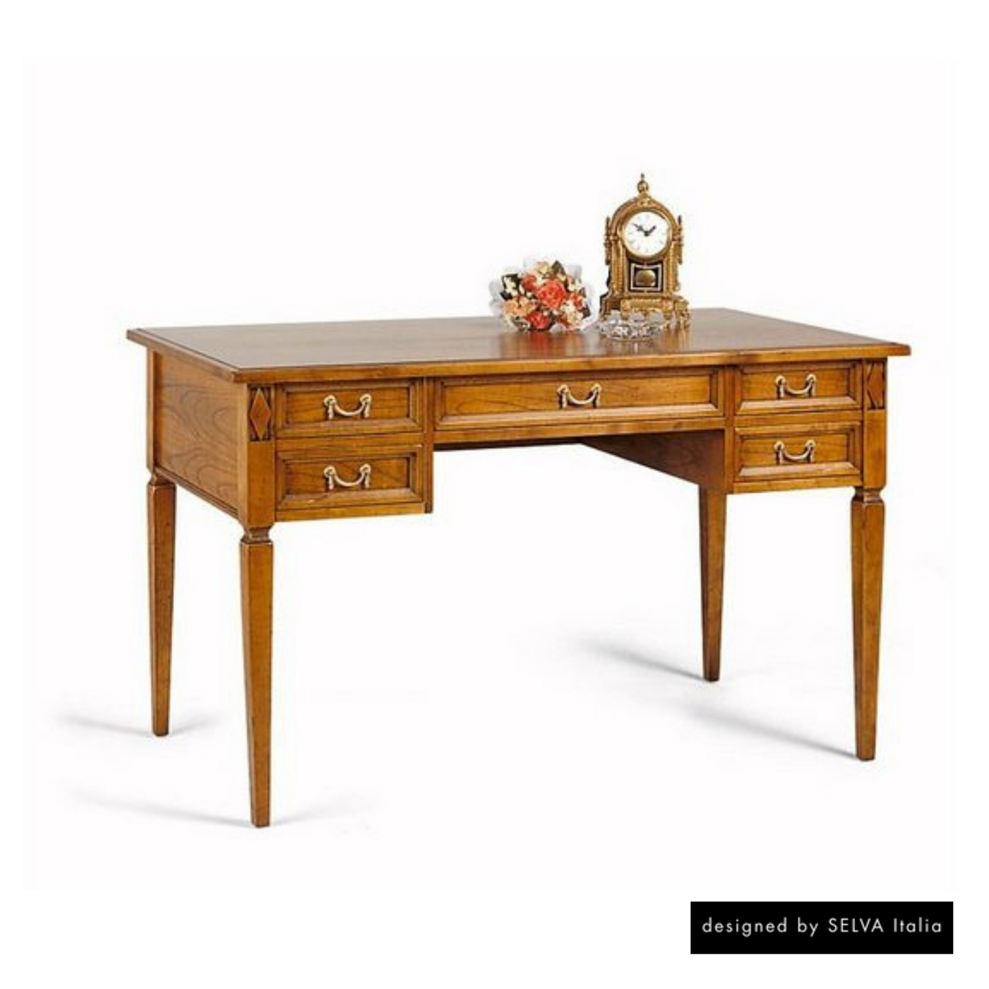 Schreibtisch, Stil Directoire. 1 große, 4 kleine Laden. Füße in Buche massiv. Massivteile in Linde, Kirschbaum furniert. Rückseite furniert. Es stehen zwei verschiedene Griffe zur Auswahl: Griff Louis XVI (M01) und Griff Directoire (M02).
