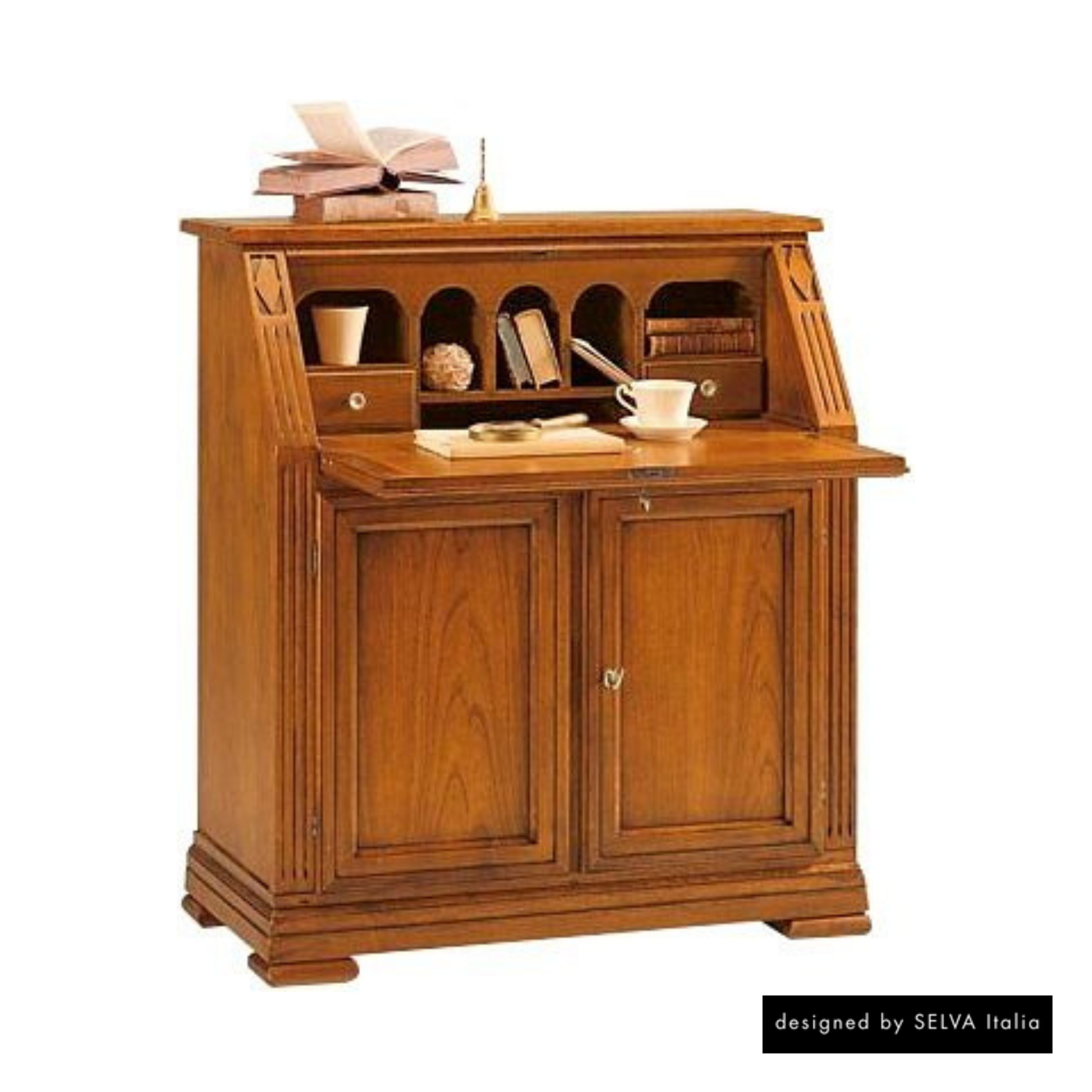Sekretär, Stil Directoire. 2 Türen, innen 1 abnehmbarer Holzeinlegeboden. 1 Schreibklappe, innen 2 kleine Laden, 5 Fächer. Massivteile in Linde, Kirschbaum furniert. Es stehen zwei verschiedene Griffe zur Auswahl: Griff Louis XVI (M01) und Griff Directoire (M02).