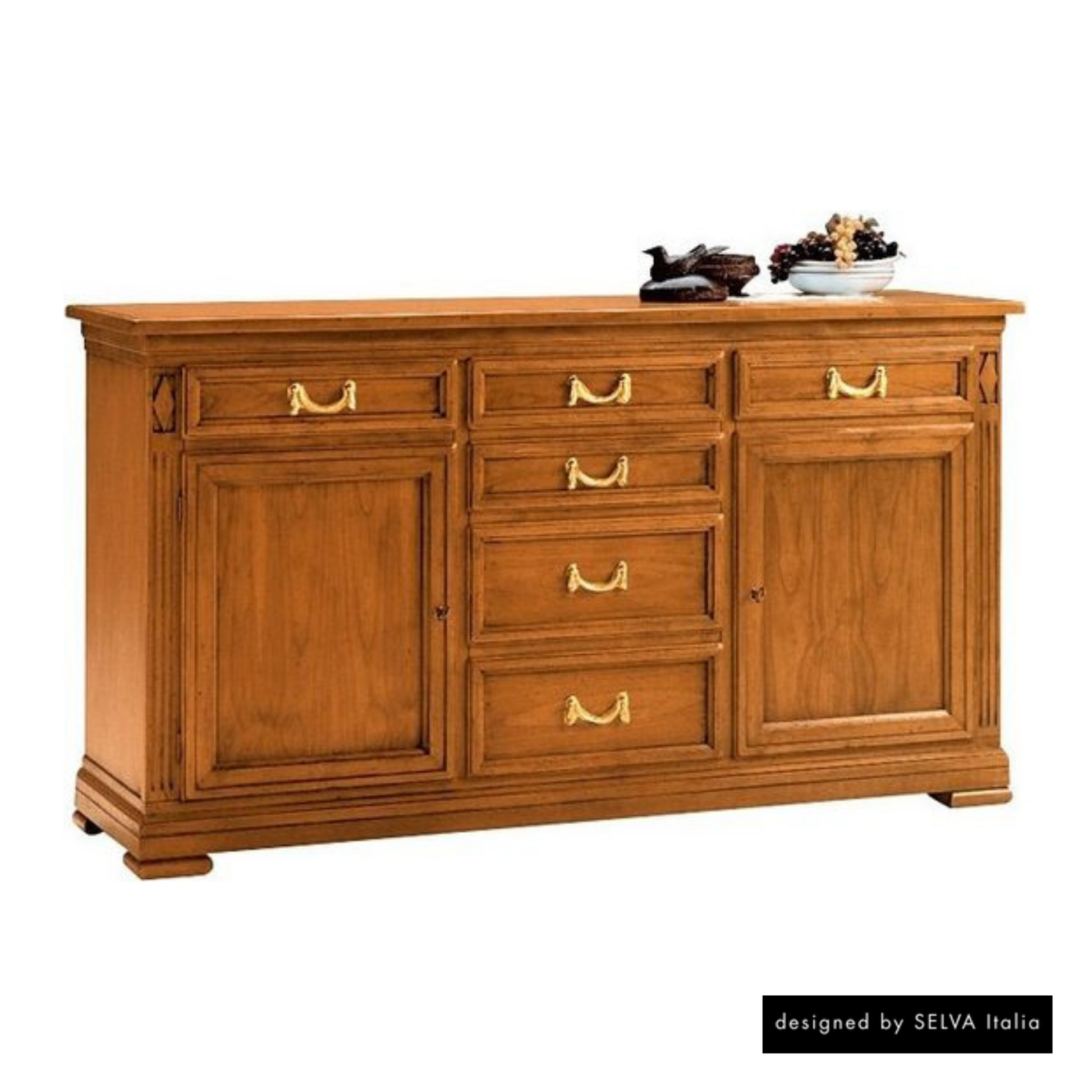 Anrichte, Stil Directoire. 2 Türen, 2 große, 4 kleine Laden, innen 1 abnehmbarer Holzeinlegeboden. Massivteile in Linde, Kirschbaum furniert. Es stehen zwei verschiedene Griffe zur Auswahl: Griff Louis XVI (M01) und Griff Directoire (M02).