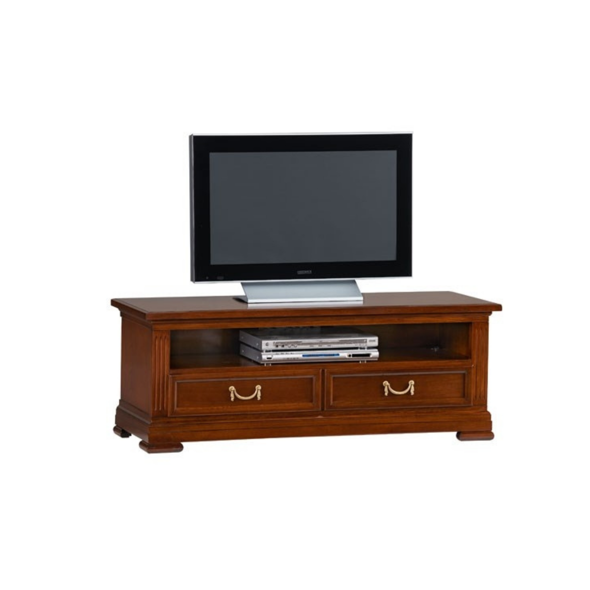 Details: TV-Möbel, Stil Directoire. 2 Laden mit Vollauszug, 1 Fach. Massivteile in Linde, Kirschbaum furniert. Es stehen zwei verschiedene Griffe zur Auswahl: Griff Louis XVI (M01) und Griff Directoire (M02).